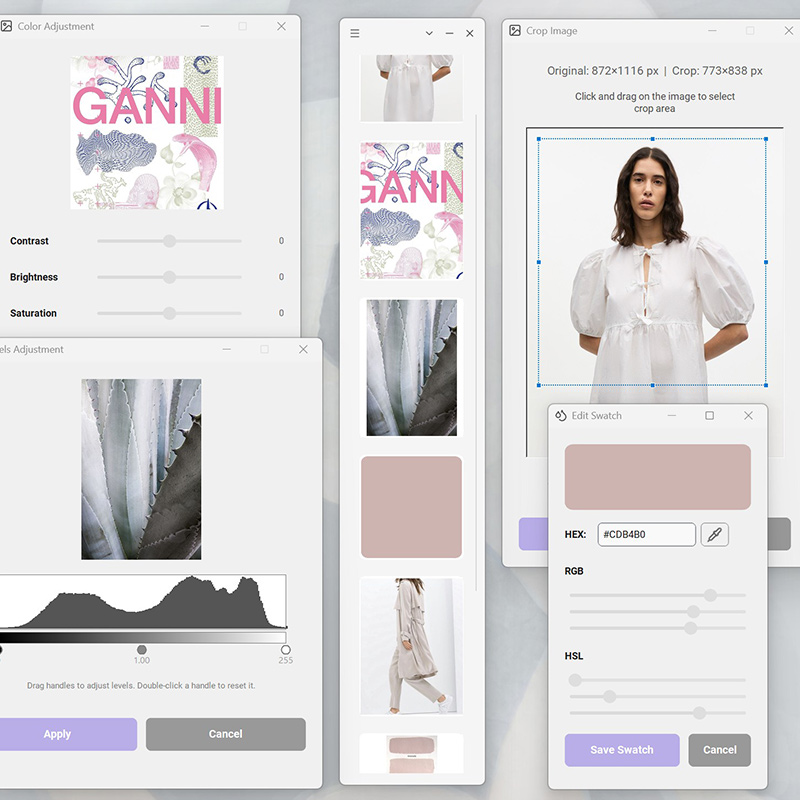 FLEX.™ is next-gen desktop software that doesn’t ask to be installed. Seriously. Download it, run the executable, and you’re in. Drag in graphics, color adjust them, do some inspo screenshots, build a few brand color swatches. Then drop those items optimized into any workflow – done. No save buttons. No friction. FLEX.™ uses persistent storage, so your work is always just… there.